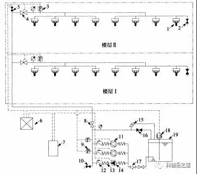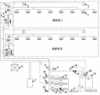 1——閉式細水霧噴頭;2——末端試水閥;3——水流傳感器;4——分區控制閥(常開(kāi),反饋閥門(mén)開(kāi)啟信號);5——排氣閥(常閉);6——火災報警控制器;7——消防泵控制柜;8——控制閥(常開(kāi));9——壓力開(kāi)關(guān);10——泄水閥(常閉);11——消防泵;12——止回閥;13——柔性接頭;14——穩壓泵;15——安全閥;16——泄放試驗閥;17——過(guò)濾器;18——液位傳感器;19——儲水箱